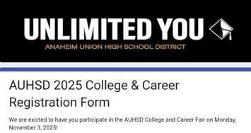 We are excited to invite you to the Anaheim Union High School District’s Annual College and Career Fair, taking place on Monday, November 3, 2025! Our goal is to offer students a meaningful experience that supports their academic growth and informs their future career pathways. We would be honored to have your organization participate in this important event.